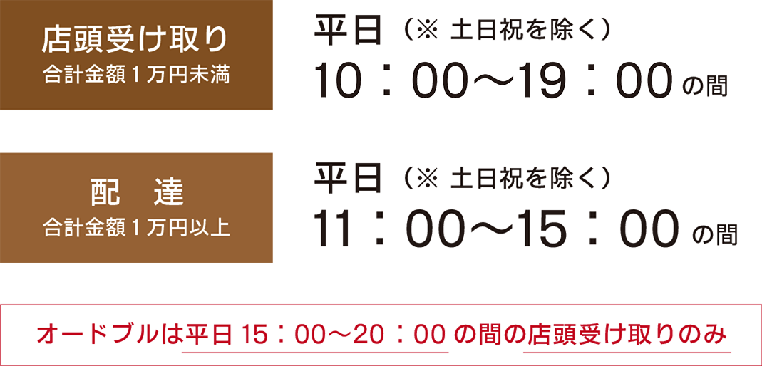 【平日】11:00〜15:00の間のみ配達可能。オードブルは平日15時以降、店頭受け渡しのみとなります